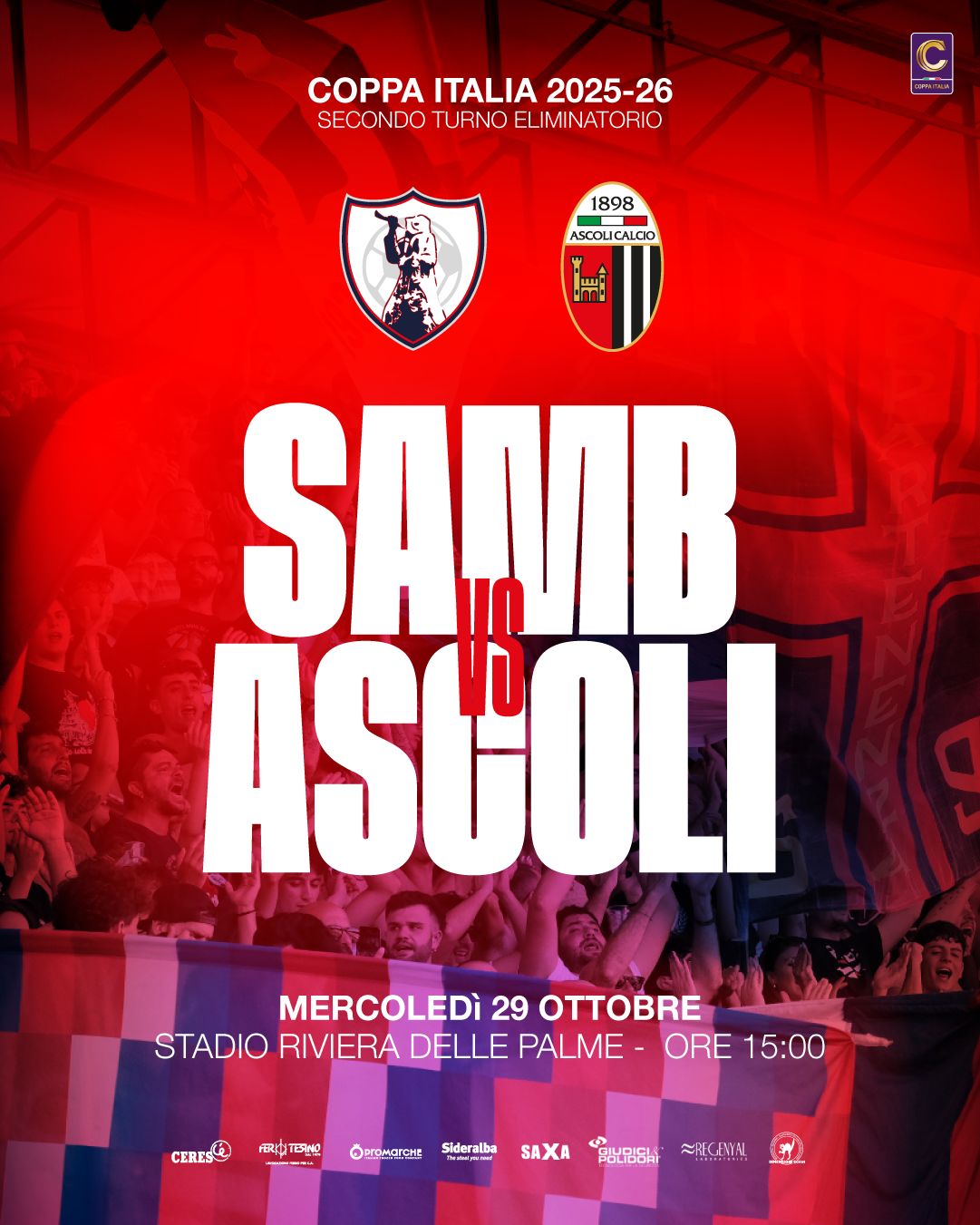 La U.S. Sambenedettese comunica che, per il Secondo Turno Eliminatorio di Coppa Italia Serie C 2025/2026 Samb – Ascoli in programma mercoledì 29 ottobre alle