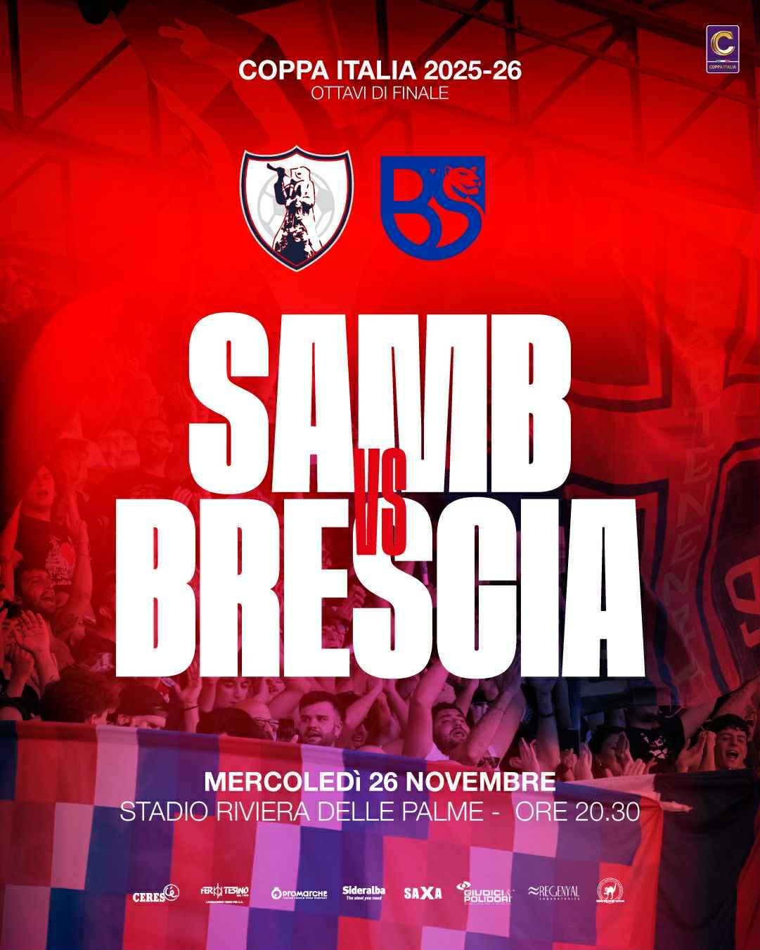 OTTAVI DI COPPA ITALIA, SARA’ SAMB-BRESCIA 01/11/2025 Nessun commento Negli Ottavi di Finale di Coppa Italia Serie C 2025/26 la U.S. Sambenedettese affronterà l’Union Brescia. L’incontro si disputerà al Riviera delle Palme mercoledì 26 Read More »